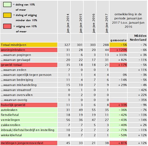 Rhenen – In de eerste zes maanden van 2017 is het totaal aantal misdrijven in Rhenen met 5% gedaald ten opzichte van 2016. De daling is iets kleiner dan de gemiddelde ontwikkeling in de regio (-7%). Opvallende stijgers zijn woninginbraken (+120%) en meldingen van jongerenoverlast (+81%). Het aantal autokraken is fors gedaald met -36%, evenals vernielingen (-43%).