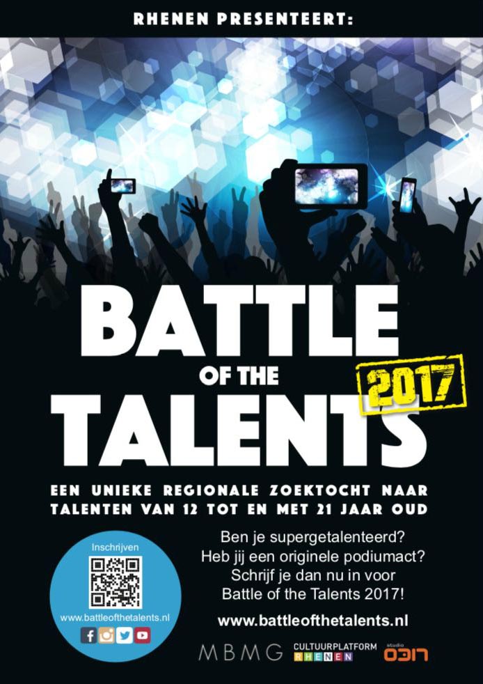 Vanwege dit succes heeft het Cultuurplatform Rhenen besloten om ook dit jaar weer een nieuwe ‘Battle of the Talents 2017’ te organiseren. Ze doen dit wederom samen met Studio 0317 en MBMG. Talenten uit de wijde omgeving kunnen zich inschrijven via de website. Een paar gegevens invullen en een YouTube filmpje is genoeg om jezelf straks in de schijnwerpers te laten staan.