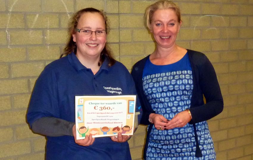 De markt was een succes! Voorzitter van de speelgoedbank, Miranda van de Weerd (links op de foto), ontving vrijdag uit handen van de directeur van de Montessorischool, Astrid Arts een cheque van €360,-. Ook werd het restant van het ingezamelde speelgoed over gedragen aan de Speelgoedbank.