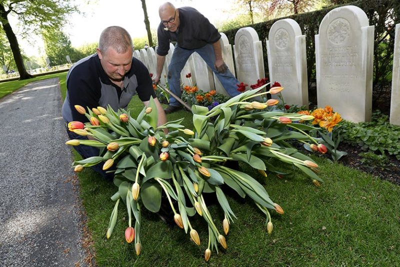 Rhenen – Bloembollenkweker JUB Holland uit Noordwijkerhout is woensdag de ‘held’ van De Grebbeberg. Nadat hij het nieuws hoorde dat noodweer de helft van de – inmiddels geruimde – 10.000 tulpen bij de graven op het militaire Ereveld had verwoest, schonk hij spontaan enkele duizenden nieuwe exemplaren. Precies op tijd om ze nog in de grond te zetten. Medewerkers van de Oorlogsgravenstichting (OGS) waren daar woensdag tot laat in de middag mee bezig. Vrijdag moeten tulpen volop in bloei staan. Kweker Dolf Uittenbogaard van JUB: “Deze jongens hebben hun leven gegeven in de strijd tegen Duitse bezetter.” Beheerder Charles Willemsen zegt “dolblij te zijn met dit fantastische initiatief. Anders had het Ereveld er vrijdag een stuk minder representatief uitgezien.” Met de nieuwe voorjaarsbloeiers is de nationale driekleur bij elk graf toch weer hersteld: oranje en rode tulpen, witte zerk en blauwe viooltjes.