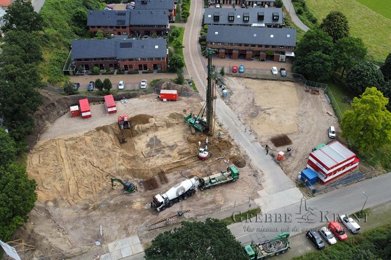 Rhenen – De bouw van het Entreegebouw van de Vogelenzang is begonnen. Met een grote grondboor worden gaten in de grond geboord waarna er betonijzer vlechtwerk in het gat wordt geplaatst. Het geheel wordt daarna vol gestort met beton.