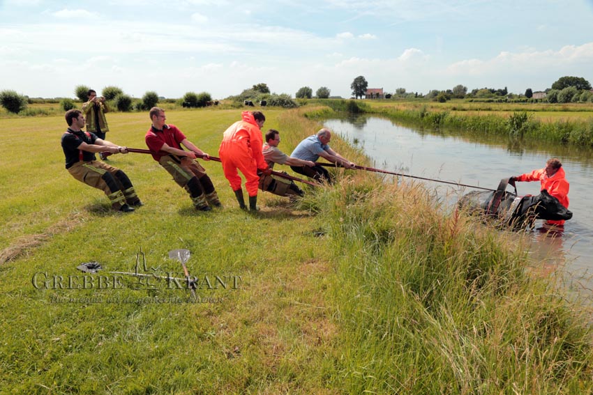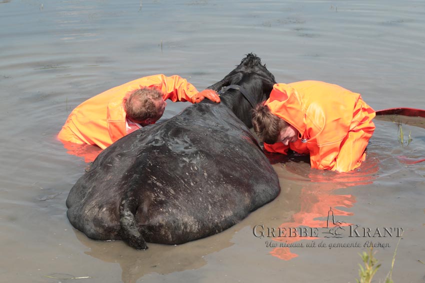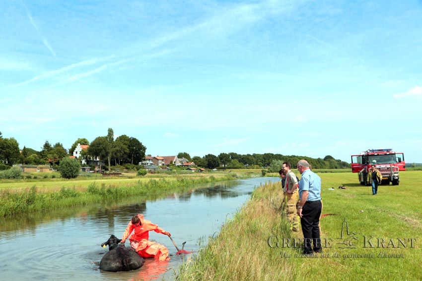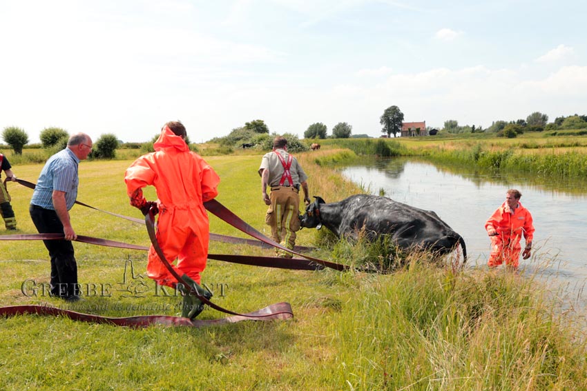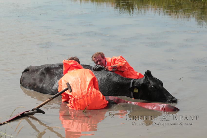 Waarschijnlijk heeft de koe voor wat verkoeling in het water gekozen maar kon zij door de modder niet meer op eigen kracht uit het water komen. 2 brandweerlieden brachten een brandslang aan onder de koe en met vereende krachten werd de koe weer op het droge getrokken. Vermoeid en geheel onder de modder werd de koe weer herenigd met de rest van de kudde.