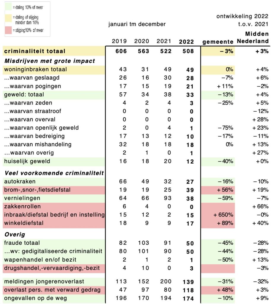 Er zijn een aantal opvallende dalers. De registratie van huiselijk geweld ging van 20 in 2021 naar 12 in 2022 (-40%). Vernielingen ging van 93 in 2021 naar 38 in 2022 (-59%). Fraude ging 91 in 2021 naar 50 in 2022 (-45%) en het aantal meldingen van jongerenoverlast ging van 200 in 2021 naar 139 in 2022 (-31%). De eerste drie delictsvormen zijn daarmee op het laagste niveau sinds 2019.