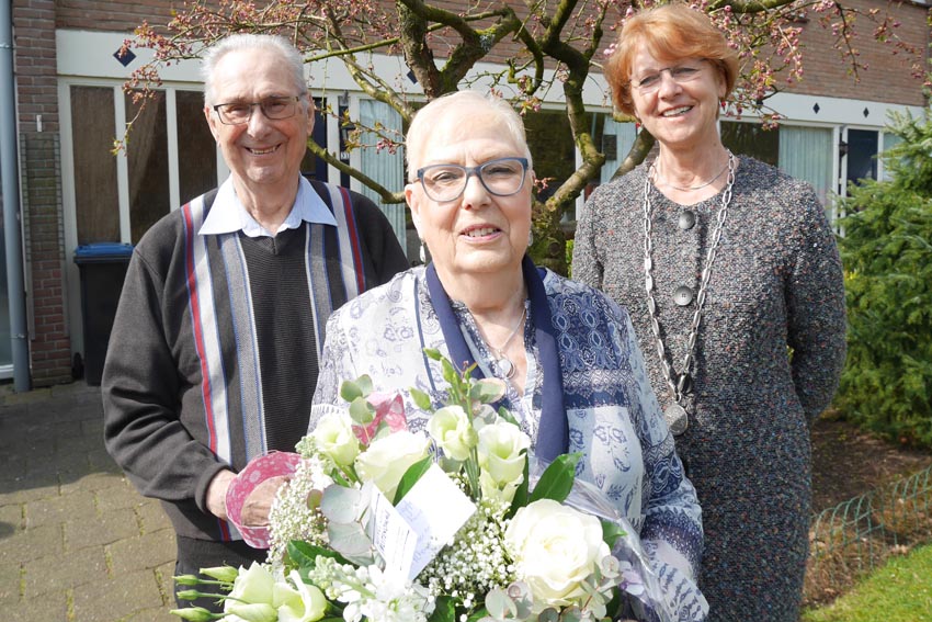 Rhenen – Op 14 april 1956 trouwden meneer en mevrouw De Betue-Holties voor de wet in Alkmaar. Wethouder Simone Veldboer kwam ze hiermee bij hun thuis, onder andere in aanwezigheid van hun 3 kinderen, van harte feliciteren. In 1958 kwam het echtpaar naar Rhenen vanwege het werk van meneer bij, naar eigen zeggen, ‘het’ DELM. Al vanaf 1961 wonen meneer en mevrouw De Betue tot volle tevredenheid aan de Ribeslaan.