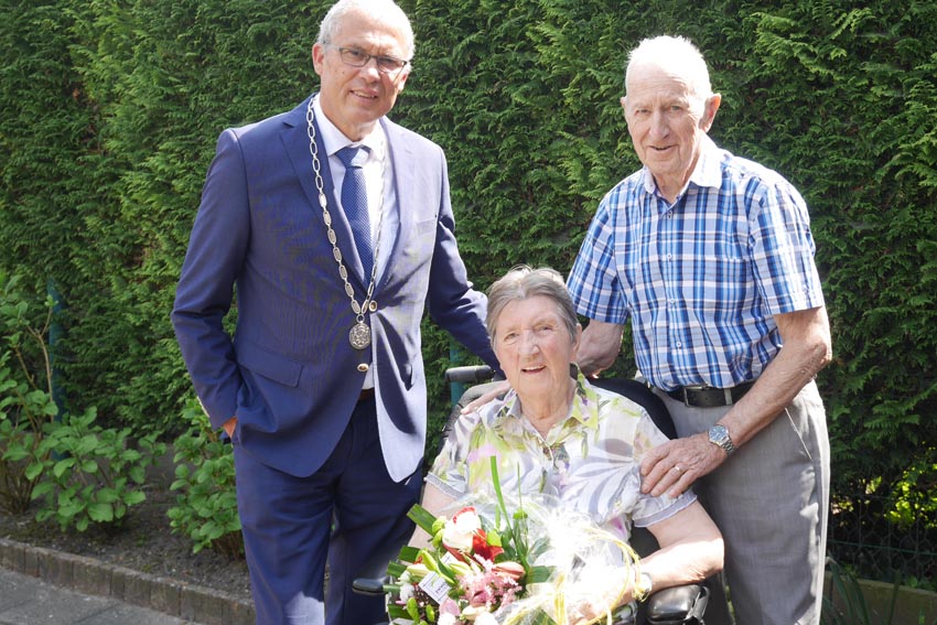 Rhenen – Op 11 mei 2016 waren dhr en mw Hermsen-Van Setten 60 jaar getrouwd. Loco-burgemeester Jan Kleijn kwam ze hiermee feliciteren. Het was een prachtige dag en mw Hermsen was thuis. Vanwege een beroerte woont ze nu in de Tollekamp, afd. De Vordel, waar haar man haar iedere dag bezoekt. Dhr Hermsen zat al op jonge leeftijd in de WAO en is als vrijwilliger voor verschillende verenigingen, o.a. 35 jaar voor de IJsclub Rhenen, heel actief geweest.