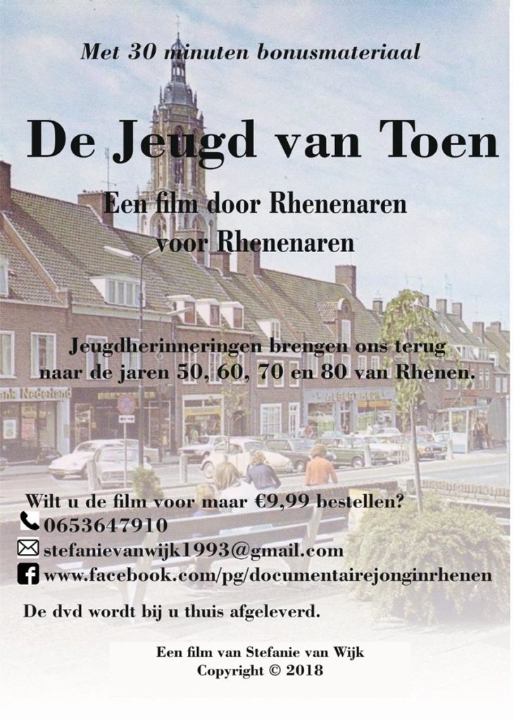 Rhenen – Ruim een jaar is Stefanie van Wijk bezig geweest met haar eerste filmproject “De jeugd van toen”. Een film voor en door Rhenenaren roept vooral veel herinneringen op. Een aantal bekende en minder bekende Rhenenaren belichten Rhenen zoals zij haar zagen in hun jeugdjaren. De film is virtueel in “première” gegaan en vanaf nu te bestellen op DVD voor slechts €9,95. Volgende week besteden wij nogmaals uitgebreid aandacht aan deze mooie productie en de totstandkoming ervan.