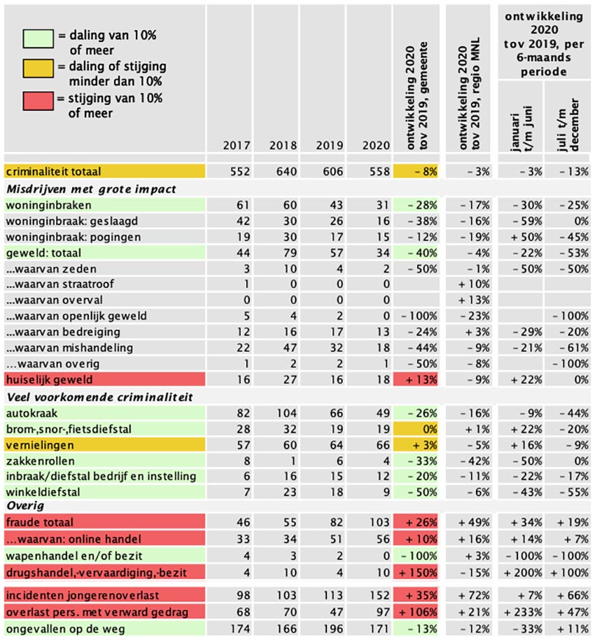 De daling in het aantal misdrijven met grote impact is enerzijds duidelijk te zien in het aantal geweldsdelicten: van 57 in 2019 naar 34 in 2020 (-40%). Anderzijds is het aantal veel voorkomende criminaliteit zoals autokraak (-26%) en winkeldiefstal (-50%) ook in 2020 afgenomen. Woninginbraak, autokraak en geweld zijn daarmee op het laagste niveau sinds 2017.