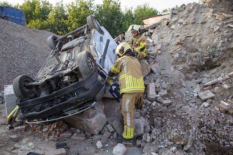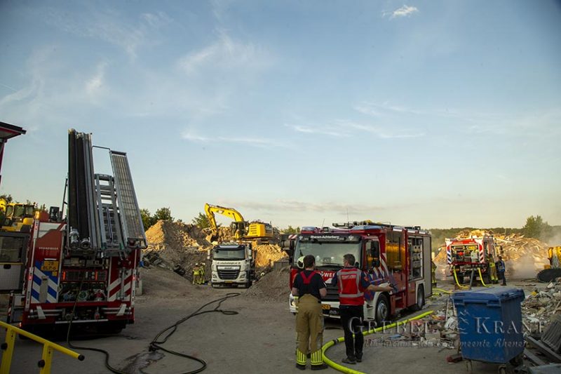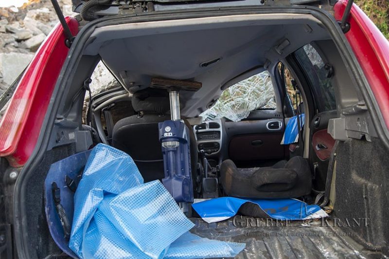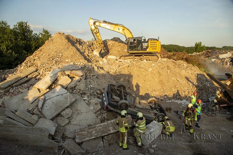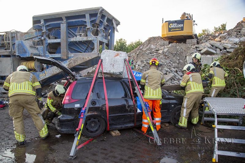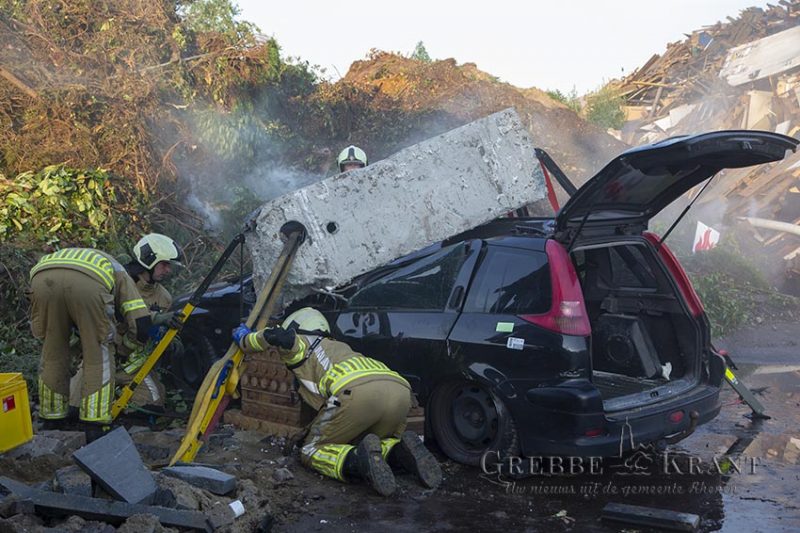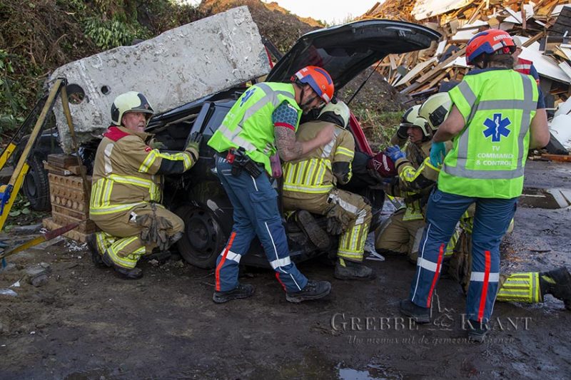 Het bosbrandvoertuig van brandweer Elst start met de bestrijding van de brand. Over het terrein liggen diverse voertuigen die door de ontploffing omver geblazen zijn. Eén van de voertuigen ligt op zijn kop. De auto wordt gestabiliseerd en met behulp van hydraulisch red-gereedschap worden de inzittenden ontzet. Bij een tweede voertuig ligt de redding iets gecompliceerder. Op het voertuig ligt een blok beton van ruim 2000kg en door de voorruit steekt een spoorbiels naar binnen. Het geheel wordt stevig gestabiliseerd en met man en macht wordt de spoorbiels uit de auto gewerkt waarna er een stoel uit het voertuig geknipt wordt. Een grote hydraulische pers moet het betonblok dat op het dak ligt tegen houden terwijl de brandweerlieden de inzittenden veilig uit het voertuig kunnen bevrijden. Nadat de stoel uit het voertuig is geknipt kunnen beide inzittenden uit het voertuig worden bevrijd.