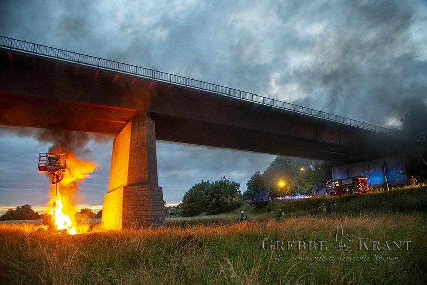 Rhenen, 02 juli 2022. Hoogwerker in brand in de uiterwaarde. Fotograaf: Peter Kuhl.