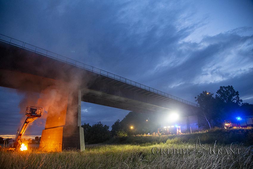 Rhenen, 02 juli 2022. Hoogwerker in brand in de uiterwaarde. Fotograaf: Peter Kuhl.