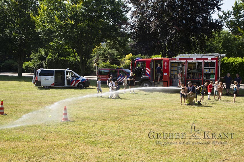 Het mooist vonden de kinderen natuurlijk het spelen met water. De kinderen konden met een bluswaterslang een tennisbal van een pion spuiten maar droog beven ze daarbij uiteraard niet.