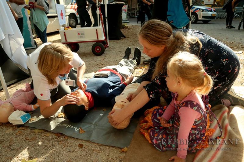 Het rode kruis was met name druk doende met reanimeren en het belang ervan. Bezoekers konden zelf oefenen in het reanimeren en het toepassen van een AED.
