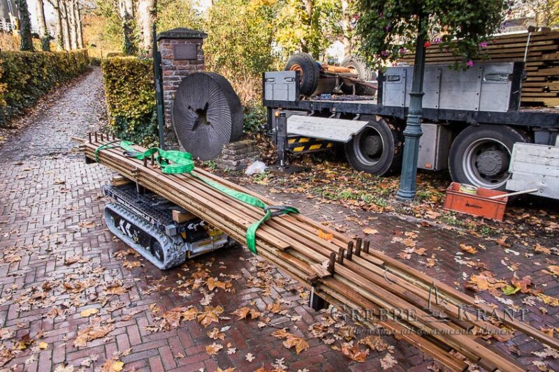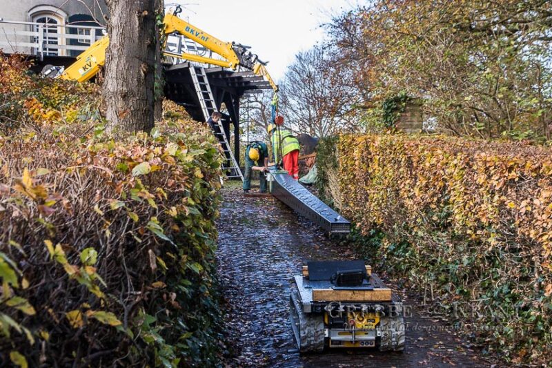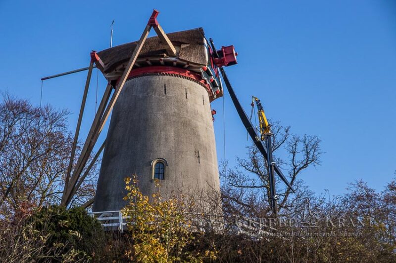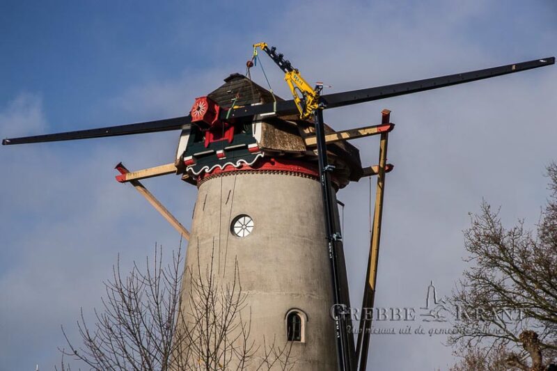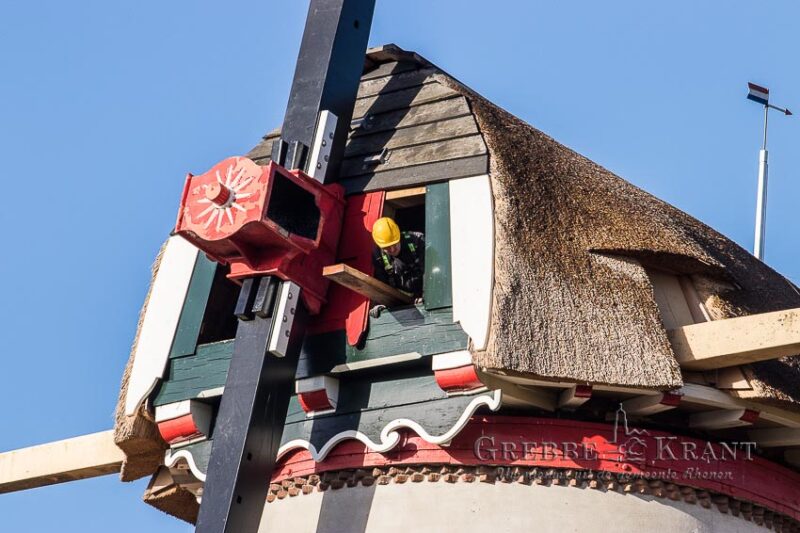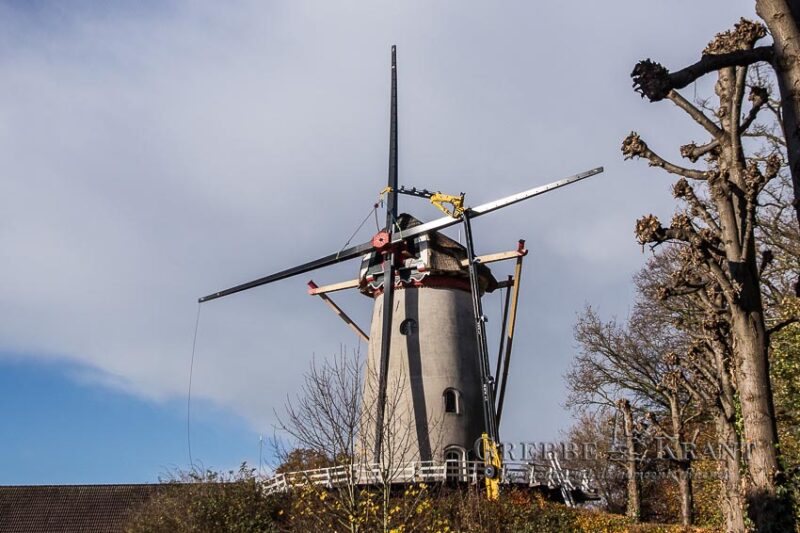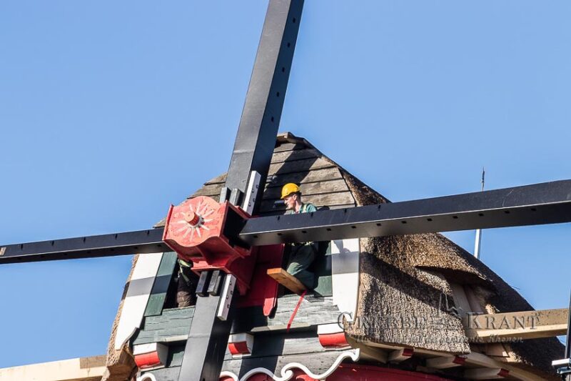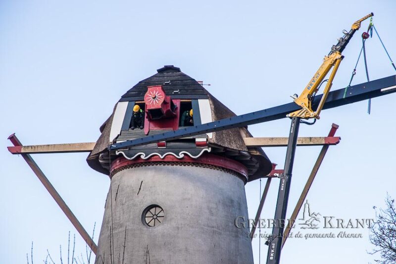 Rhenen – Maandag zijn de nieuwe metalen roeden geleverd voor de Binnenmolen in het centrum van Rhenen. Met uiterste precisie werden de lange roeden opgetild en in de askop gestoken. Nu de roeden op hun plaats zijn, kan het houten hekwerk aan de roeden bevestigd gaan worden.