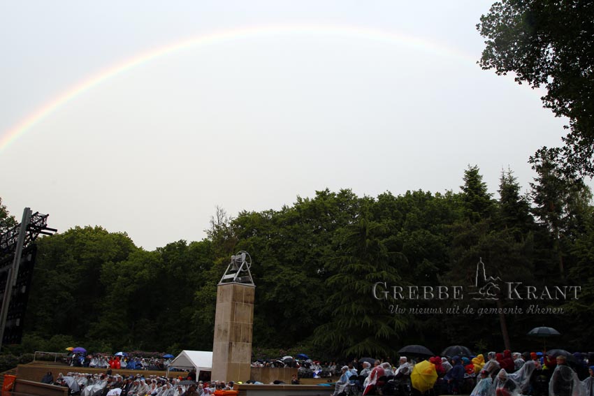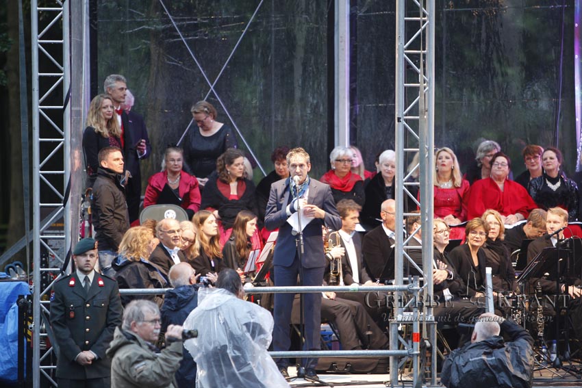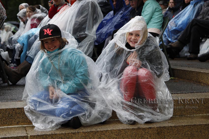 Rhenen, 29 mei 2015 – Het weer zat niet mee voor de organisatoren van de slotavond ter gelegenheid van de herdenking ’75 jaar slag om de Grebbeberg’. Gratis beschikbaar gestelde regenponcho’s moesten de bezoekers tijdens het concert nog een beetje droog houden.