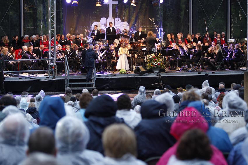 Rhenen, 29 mei 2015 – Het weer zat niet mee voor de organisatoren van de slotavond ter gelegenheid van de herdenking ’75 jaar slag om de Grebbeberg’. Gratis beschikbaar gestelde regenponcho’s moesten de bezoekers tijdens het concert nog een beetje droog houden.