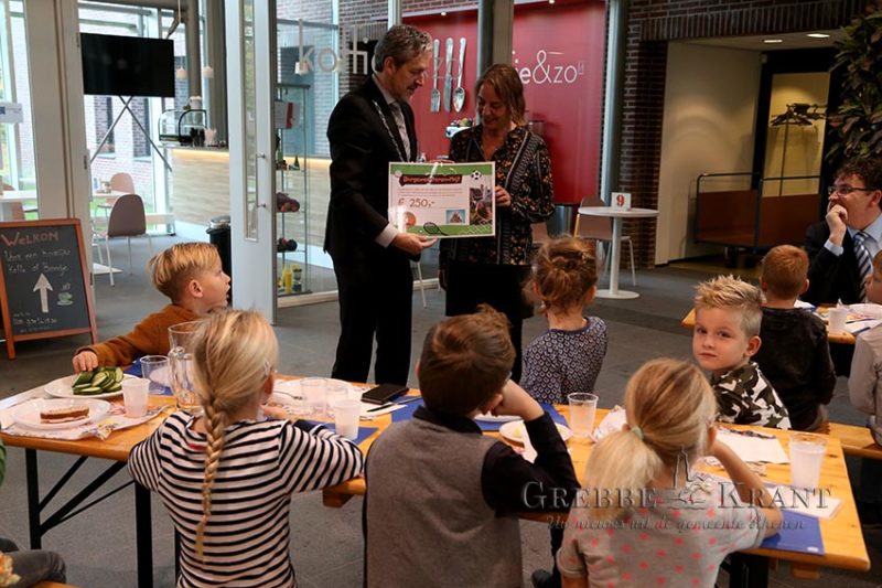 Rhenen – Vanmorgen was het een gezellige drukke boel in de hal van het Huis van de gemeente. Dit vanwege het Nationaal Schoolontbijt. 20 kinderen uit groep 2/3 van de Ericaschool genoten samen met burgemeester Hans van der Pas van een lekker ontbijt. Een goed gebruik tijdens het Nationaal Schoolontbijt is dat de burgemeester symbolisch ‘betaalt’ voor het ontbijt door een donatie te doen aan een goed doel. Dit jaar heeft burgemeester Hans van der Pas een donatie van € 250 gedaan aan de Buurthuiskamer aan de Dr. Wallerstraat voor de aanschaf van speelattributen en speelgoed.