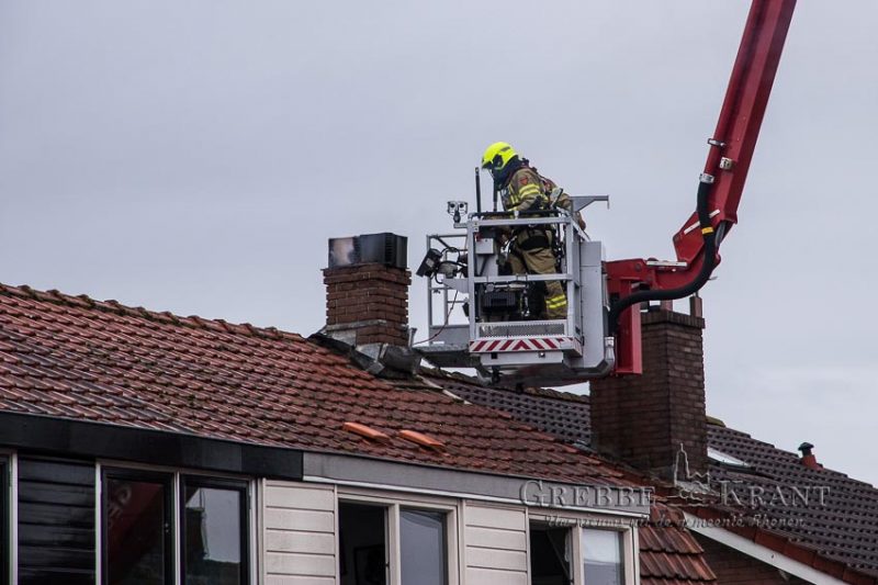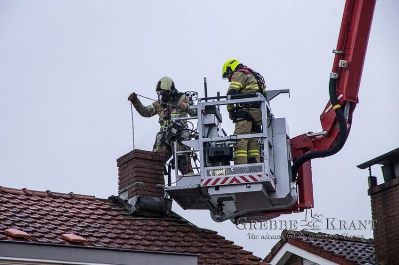 Met behulp van de hoogwerker zijn de dakpannen rondom de schoorsteen verwijderd en is het dak gecontroleerd op doorslag. Daarna is de schoorsteen met een ramoneur geveegd om de laatste gloeiende resten te verwijderen.