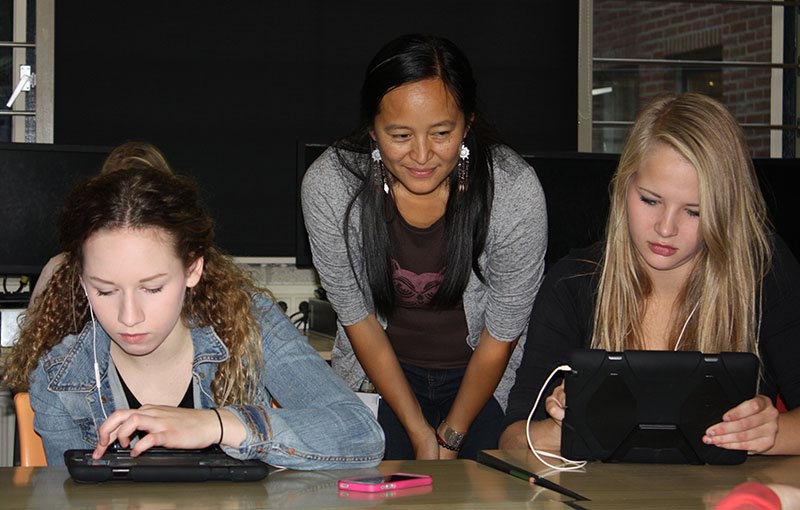 Op de foto: Workshop “Klankbeelden maken” door de leerlingen CKV van Pantarijn Rhenen met in het midden docente Tamara Kho.
