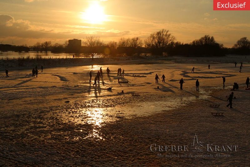 Rhenen – Slechts enkele nachten vorst waren genoeg om het kwelwater in de uiterwaarden bij de Cuneralaan in een ijsbaan te doen veranderen. Daar waar vroeger een geluidswagen door de straten trok om de schaatsers naar de Blauwe Kamer te lokken is dat voor deze lokatie niet nodig. De jeugd had het ijs zelf al gevonden. “Dit is de eerste keer dat ik op natuurijs schaats in mijn leven”, vertelde één van de jeugdigen trots. Sleetje rijden en schaatsen, de winter is los!
