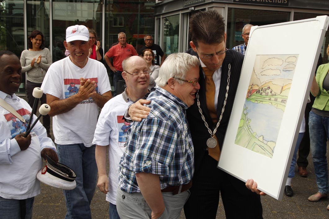 Rhenen – 24 juni 2014. Burgemeester Joost van Oostrum van de gemeente Rhenen neemt deze week afscheid van zijn gemeente en inwoners. Cliënten van Zideris die in de woonkern Heimerstein wonen, wilden ook graag gedag zeggen. Met de Ziderisband én een passend schilderij werd het afscheidsfeestje feestelijk ingezet: “Zideris had zich geen betere burgemeester kunnen wensen”.